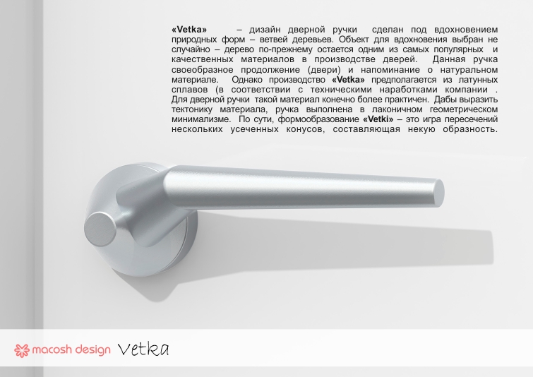 Концепция: - дизайн дверной ручки для Valli&Valli сделан под вдохновением природных форм – ветвей деревьев. Объект для вдохновения выбран не случайно – дерево по-прежнему остается одним из самых популярных и качественных материалов в производстве дверей. Данная ручка своеобразное продолжение (двери) и напоминания о натуральном материале. Однако производство «Vetka» предполагается из латунных сплавов (в соответствии с техническими наработками компании Valli&Valli). Для дверной ручки такой материал конечно более практичен. Дабы выразить тектонику материала, ручка выполнена в лаконичном геометрическом минимализме. По сути, формообразование «Vetki» – это игра пересечений нескольких усеченных конусов, составляющая некую образность.