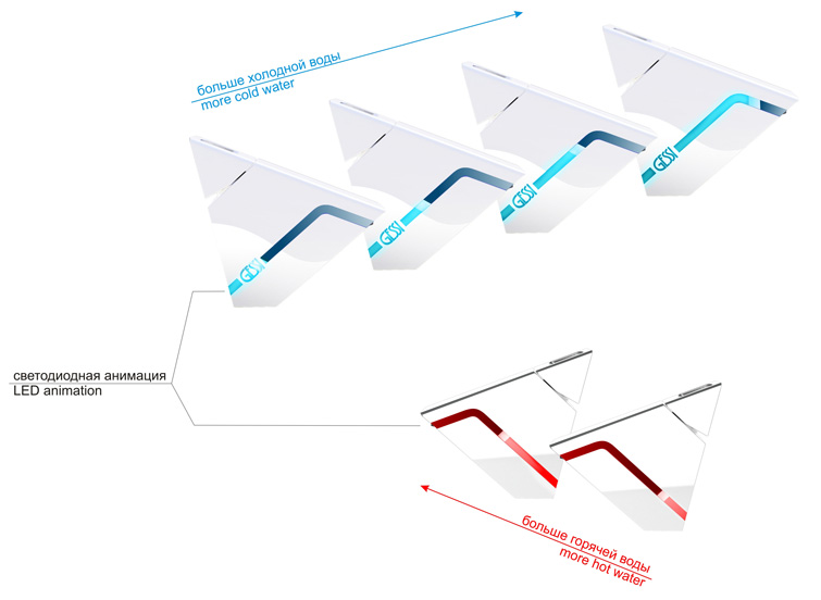 Концепция: Смеситель PRISMA представляет собой единую геометрическую форму – призму! По бокам расположены светодиодные полосы, показывающие напор горячей и холодной воды, а также в какую сторону поворачивать рычаг для увеличения или понижения температуры воды. Светодиоды включаются при включении воды и отключаются при ее отключении. При увеличении температуры по красной полоске проходит светомузыка, при уменьшении температуры светомузыка проходит по синей полоске. 3 варианта дизайна для различных вкусов.
